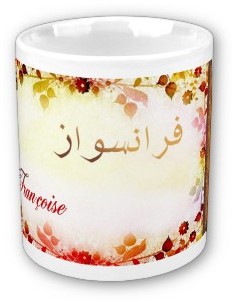 Mug avec le prénom "Françoise" calligraphié en arabe (فرانسواز) ainsi que son épellation lettre par lettre en arabe.