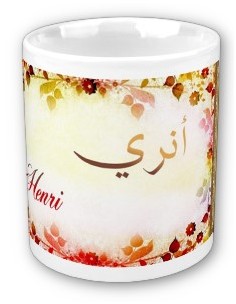 Mug avec le prénom "Henri" calligraphié en arabe (انري) ainsi que son épellation lettre par lettre en arabe.