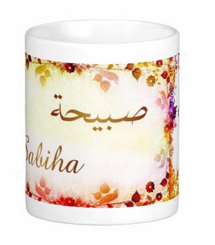 Mug avec le prénom "Sabiha" écrit en français, en arabe (صبيحة) et calligraphié de façon artistique en arabe sur la partie droite.