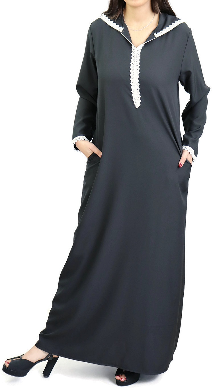 Abaya marocaine avec dentelle argentée sur le devant, sur les manches et sur le pourtour de la capuche. Deux poches sur les côtés pratiques pour ranger vos effets personnels.