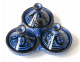 Joli récipient bleu pétrole, de taille petite, en poterie, de provenance de Marrakech (Maroc), émaillé et cerclé de métal ornemental argenté légèrement ciselé.