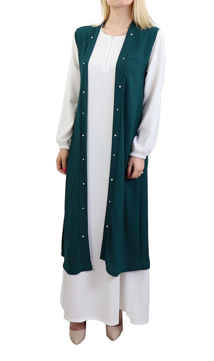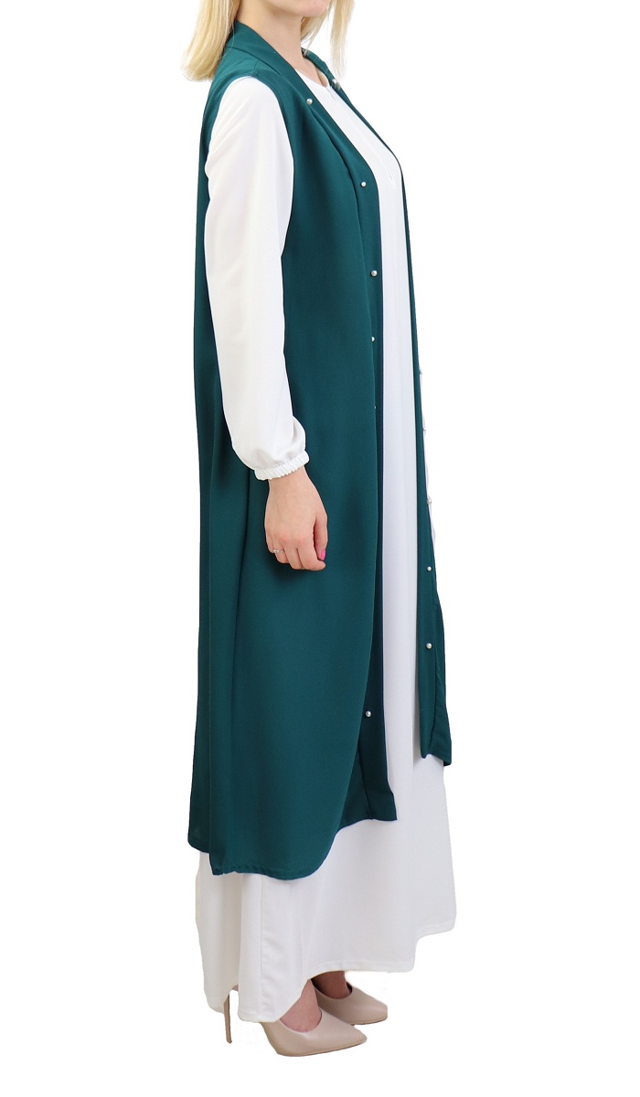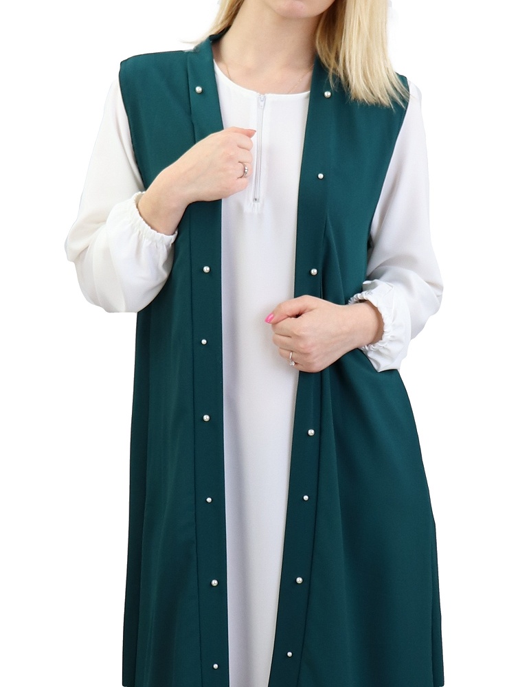 Gilet long, sans manche, décoration perlée, tissu fluide, effet crêpe.