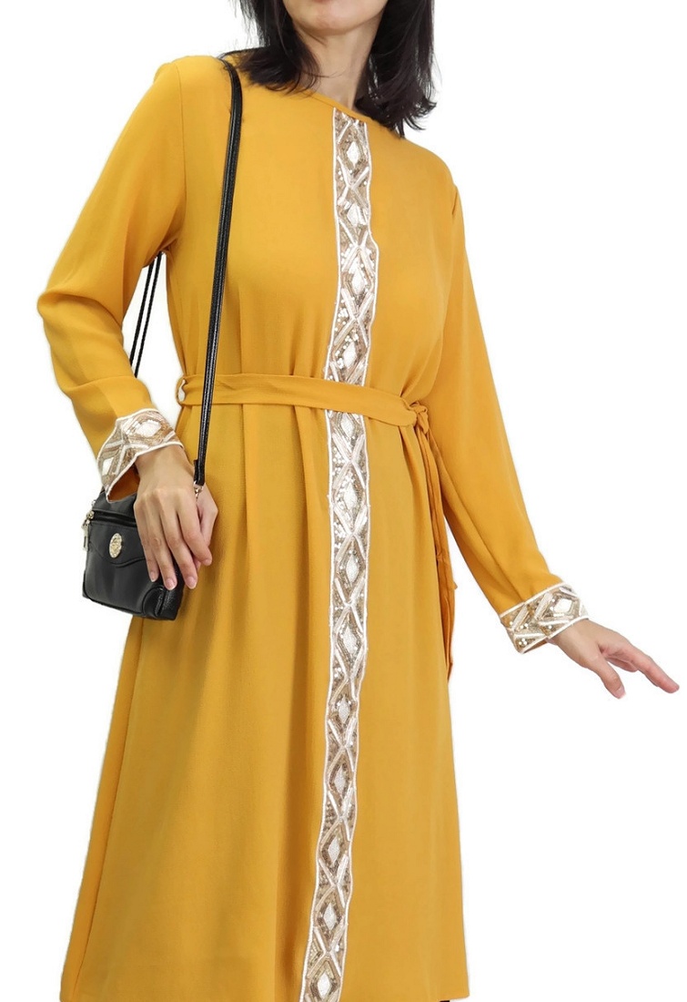 Cette tunique en crêpe, légère et agréable, est ornée d'une bande brodée à strass dorés. Elle peut se porter décontractée ou un peu plus habillée avec sa ceinture assortie.