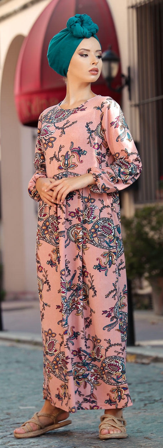 Robe longue, col rond, manches finition élastiques aux poignets, taille froncée. Cette robe à imprimés "motifs cachemire" un style unique, oriental, tout simplement indémodable.