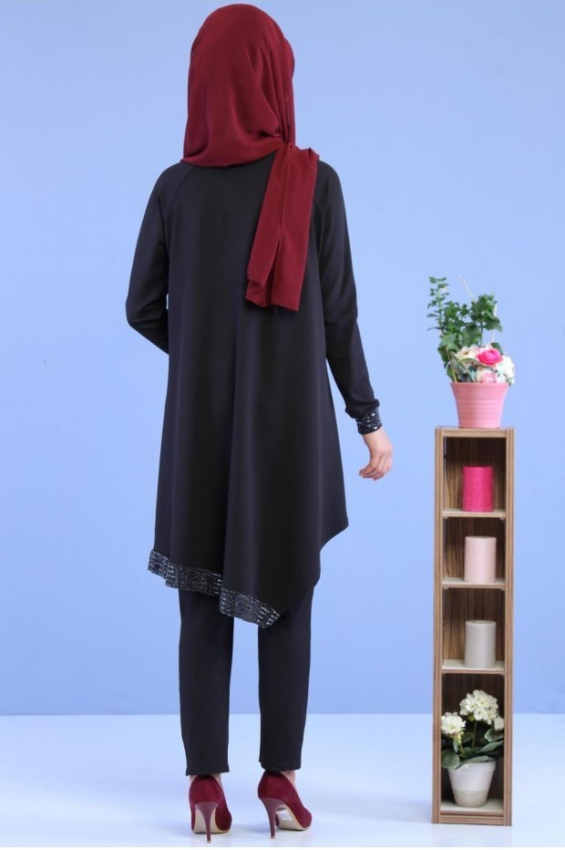 Ensemble 2 pièces : Tunique longue, coupe évasée, bande brillante au niveau de poignets et le bas de la tunique, pantalon coupe cigarette taille élastique. Cet ensemble sobre et élégant n'a besoin de rien d'autre pour être mis en valeur.