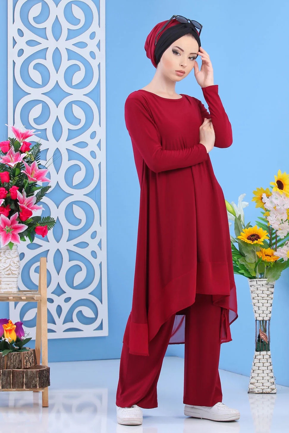 Ensemble 2 pièces, tunique mi longue, col rond, coupe évasée, manches longues. Pantalon coupe ample, taille élastique. Joli ensemble simple et chic avec son tissu léger et agréable. Ce modèle permet d’être porté en toute décontraction et en toute saison.