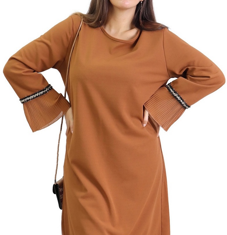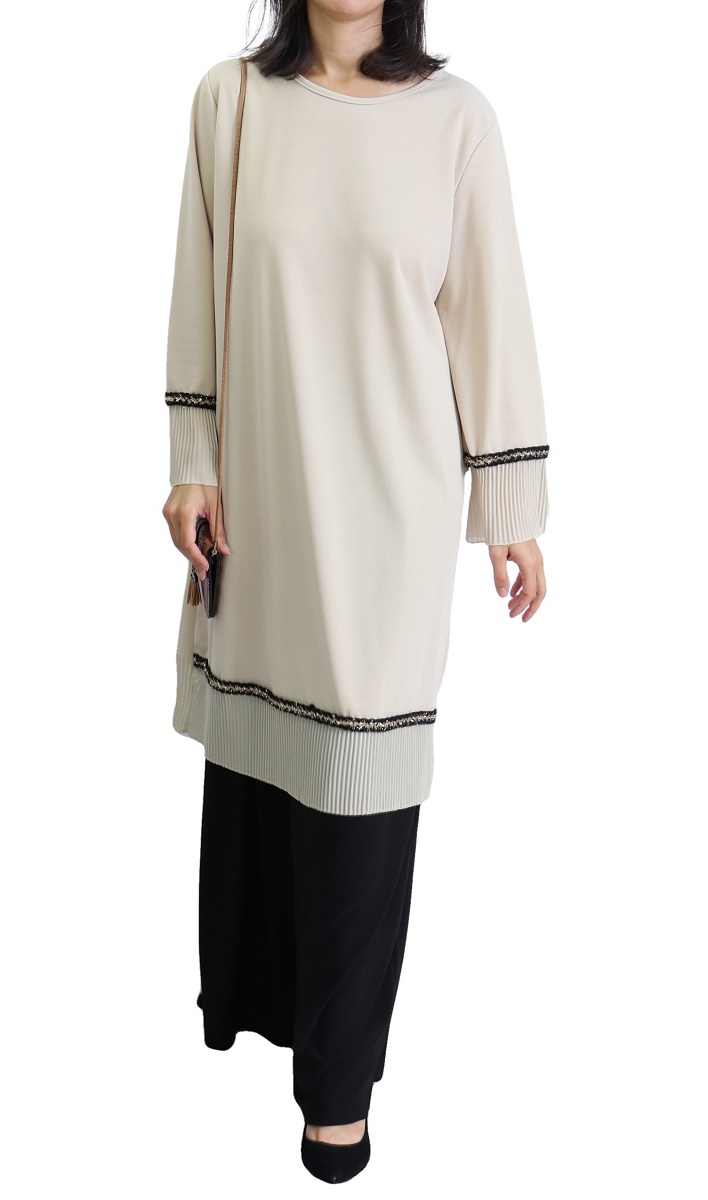 Tunique ample col rond, toutes saisons, plissée au niveau des manches et du bas. Bandes noires tressées pailletées. Tissu opaque.