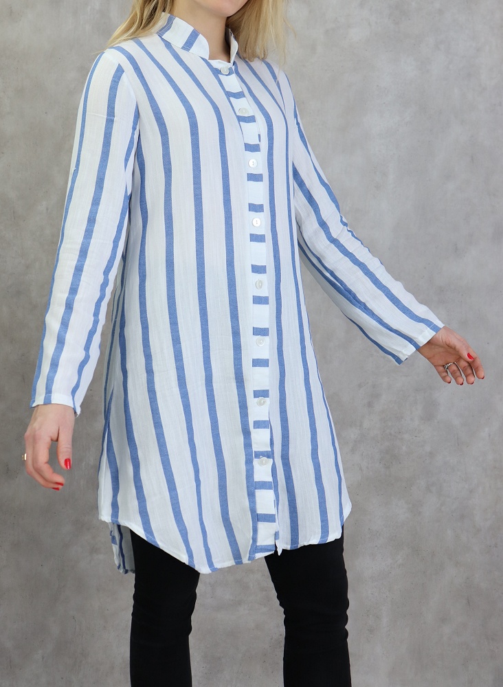 Chemise mi longue, col mao, manches ajustables (retroussables), fermeture boutons, tissu coton.