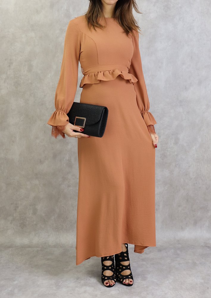 Robe longue évasée, col rond, fermeture glissière au dos, manches finition élastique froufrous et dentelles aux poignets, taille cintrée ornée d'un volant, ceinture assortie à passants, tissu doux, fluide et opaque.