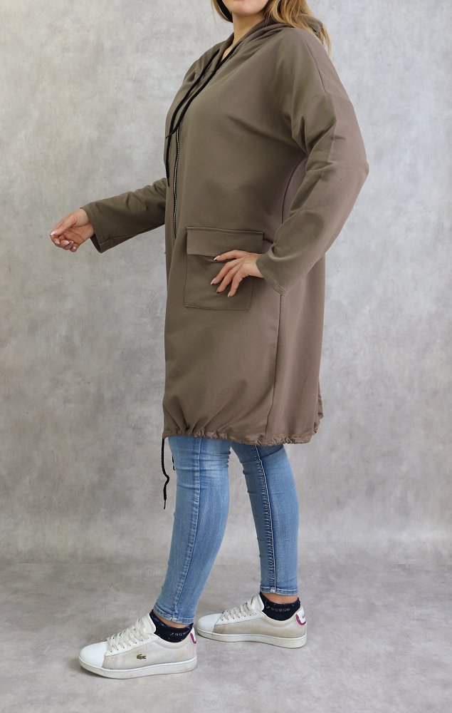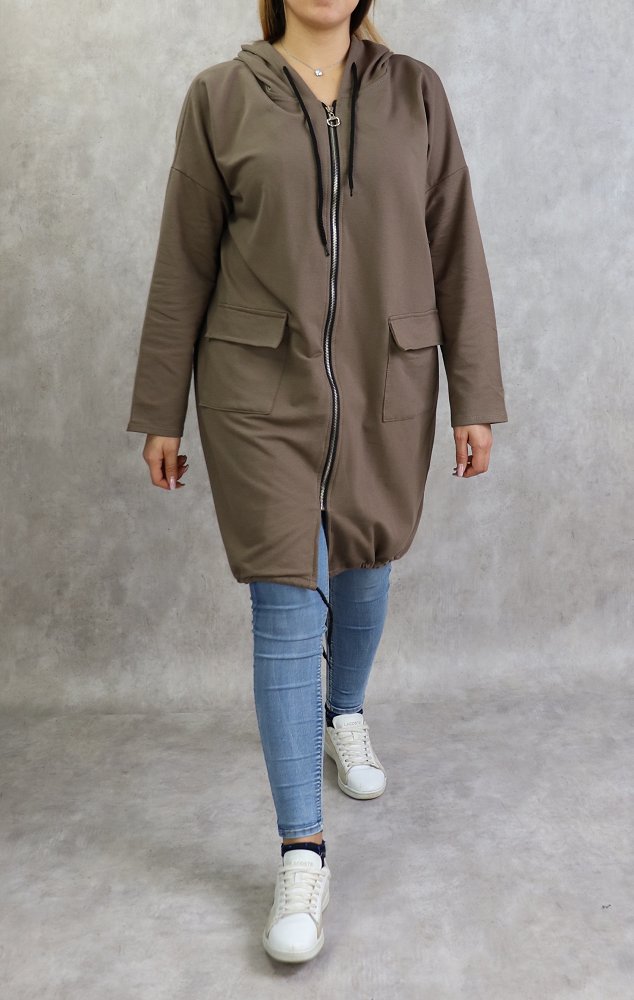 Veste zippée, manches longues, capuche avec lien de serrage ainsi qu'en bas du vêtement, poches plaquées à rabats. Coupe droite, matière sweat agréable à porter.