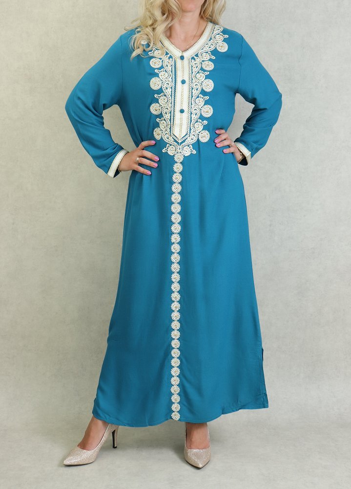 Robe Algérienne longue avec broderie et strass sur toute la longueur ; style caftan. Le double avantage de ce modèle est d'être confortable et élégant à la fois.