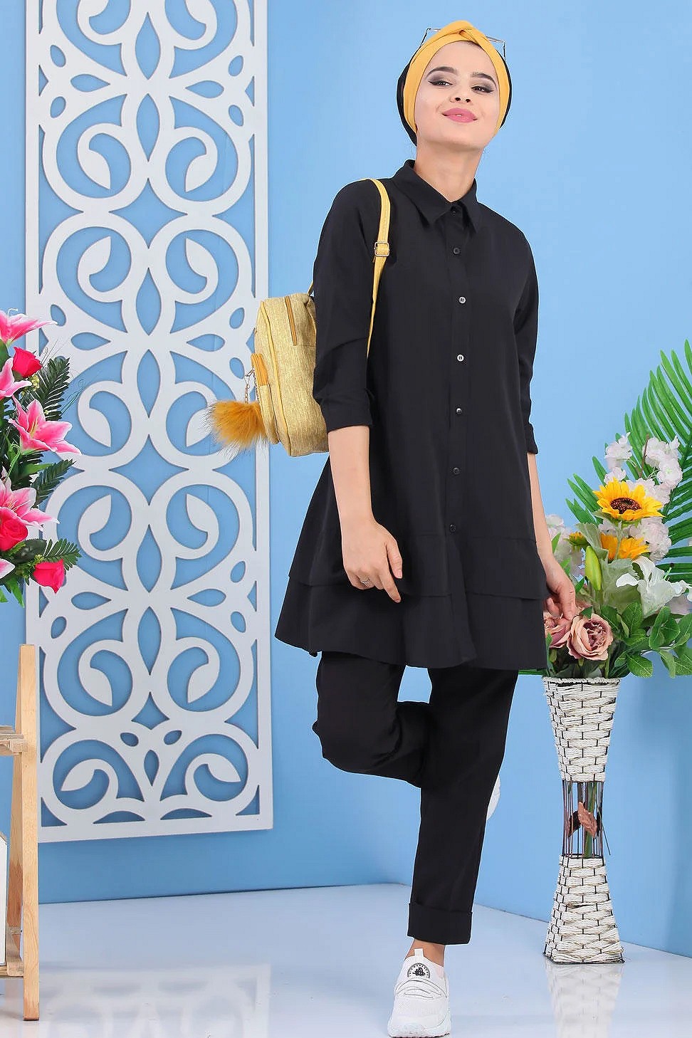 Chemise longue, col chemise, manches finition bouton, fermeture boutons, tissu non transparent. Volant sur le bas.