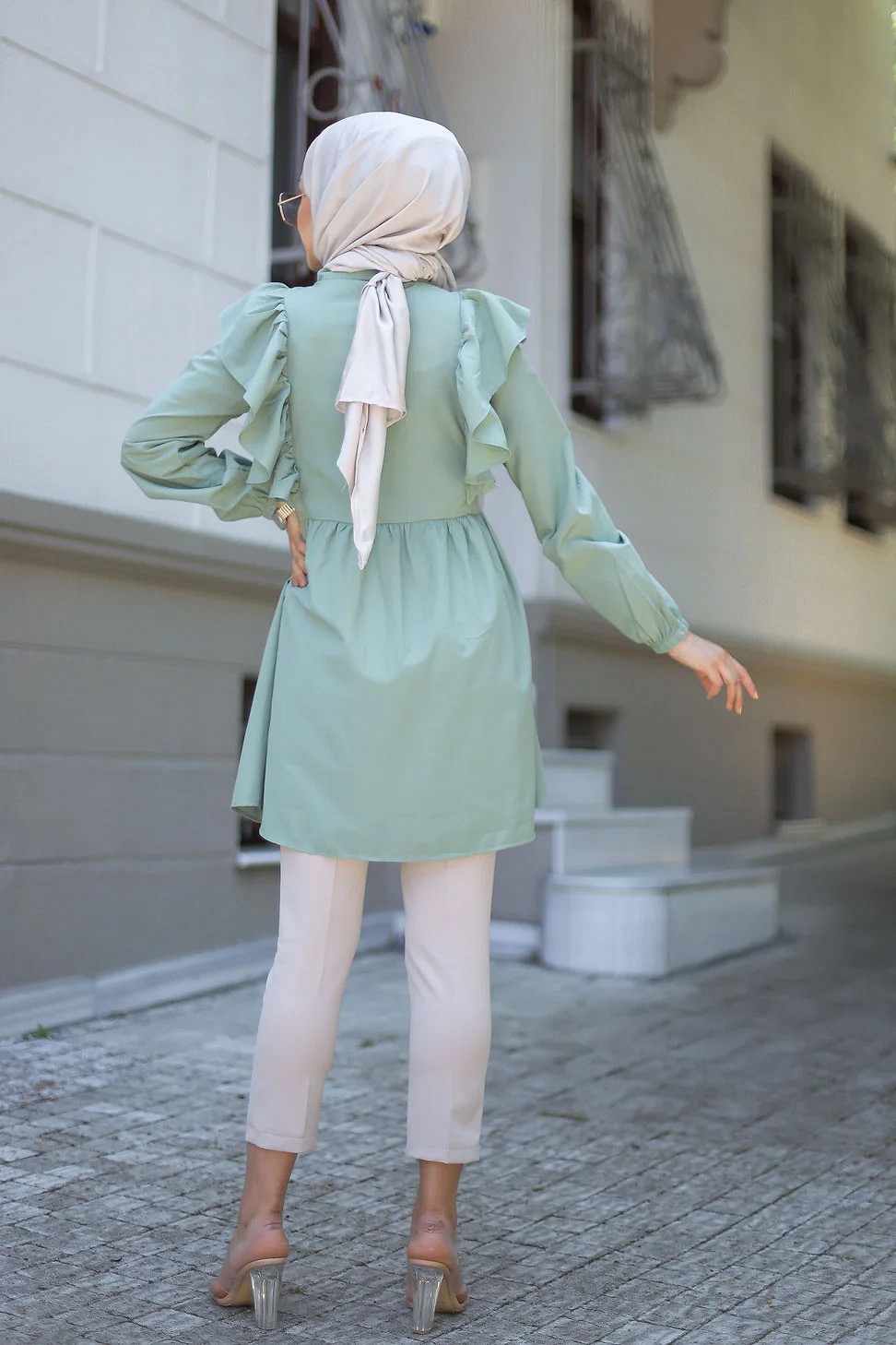 Cette chemise à froufrou s'adapte à tous les styles. Existe en d'autres couleurs faciles à accorder avec son hijab.