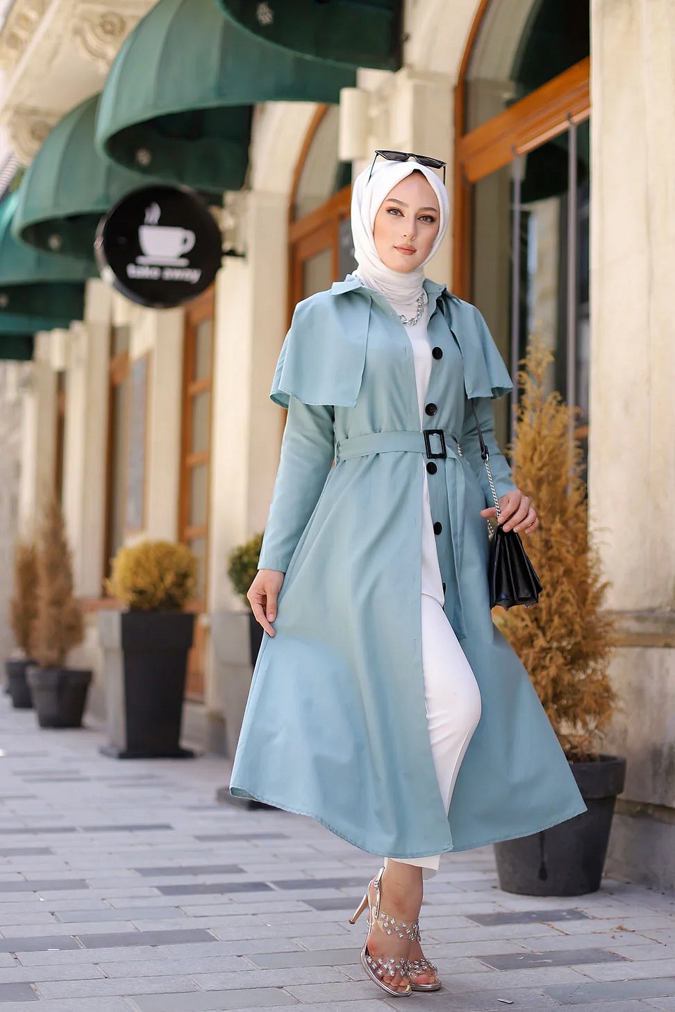 Robe mi longue, fermeture boutons sur toute la longueur, empiècement sur les épaules style "TRENCH", ceinture assortie à passants. Coupe cintrée à la taille puis évasée, tissu léger et opaque