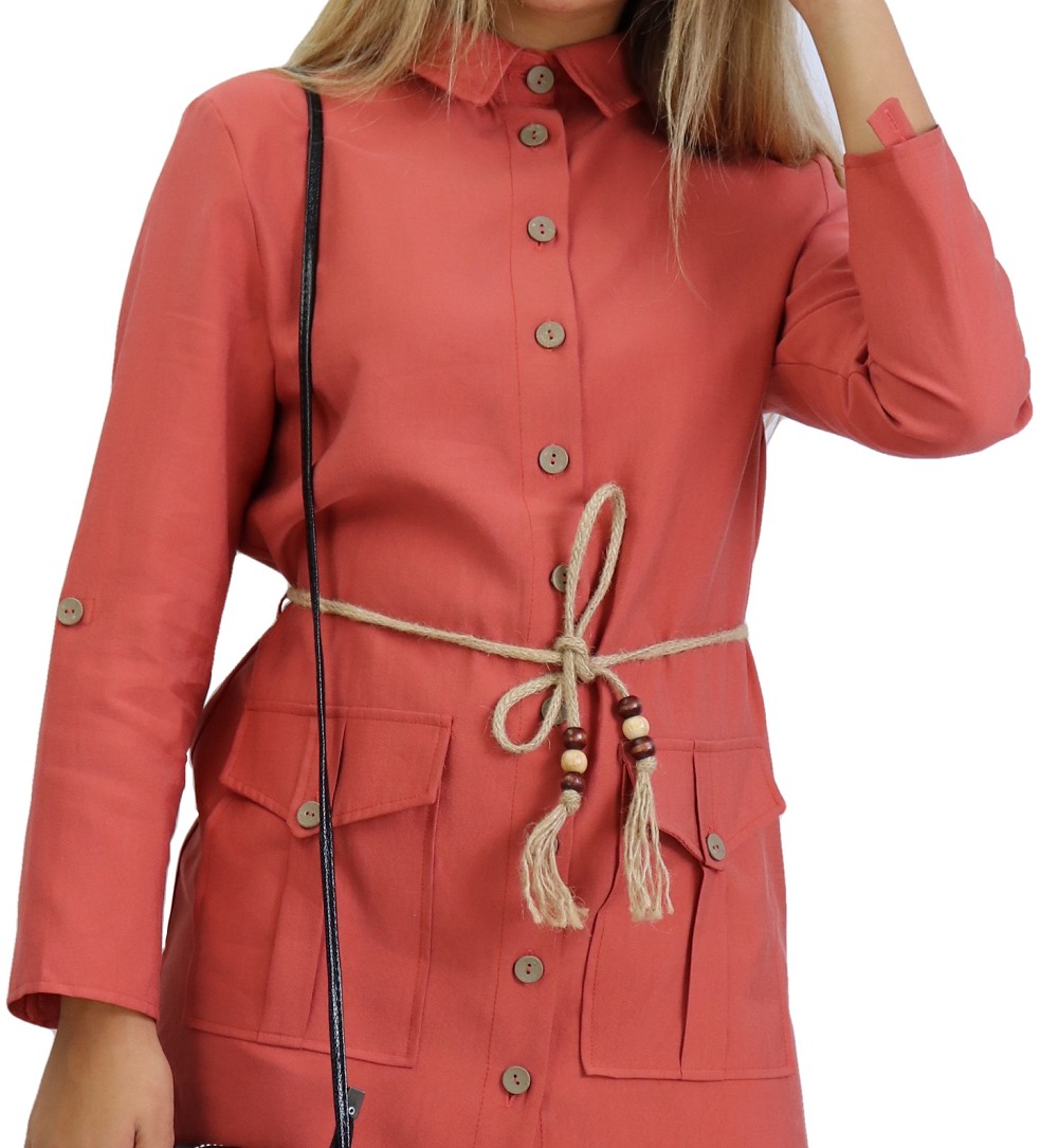 Ensemble 2 pièces. Veste : mi longue, col chemise, fermeture boutons, manches ajustables, ceinture tressée ornée de perles en bois, 2 poches plaquées à rabats. Pantalon : coupe droite, fermeture à glissière, boutons sur le bas. Tissu léger et opaque, effet tissé.