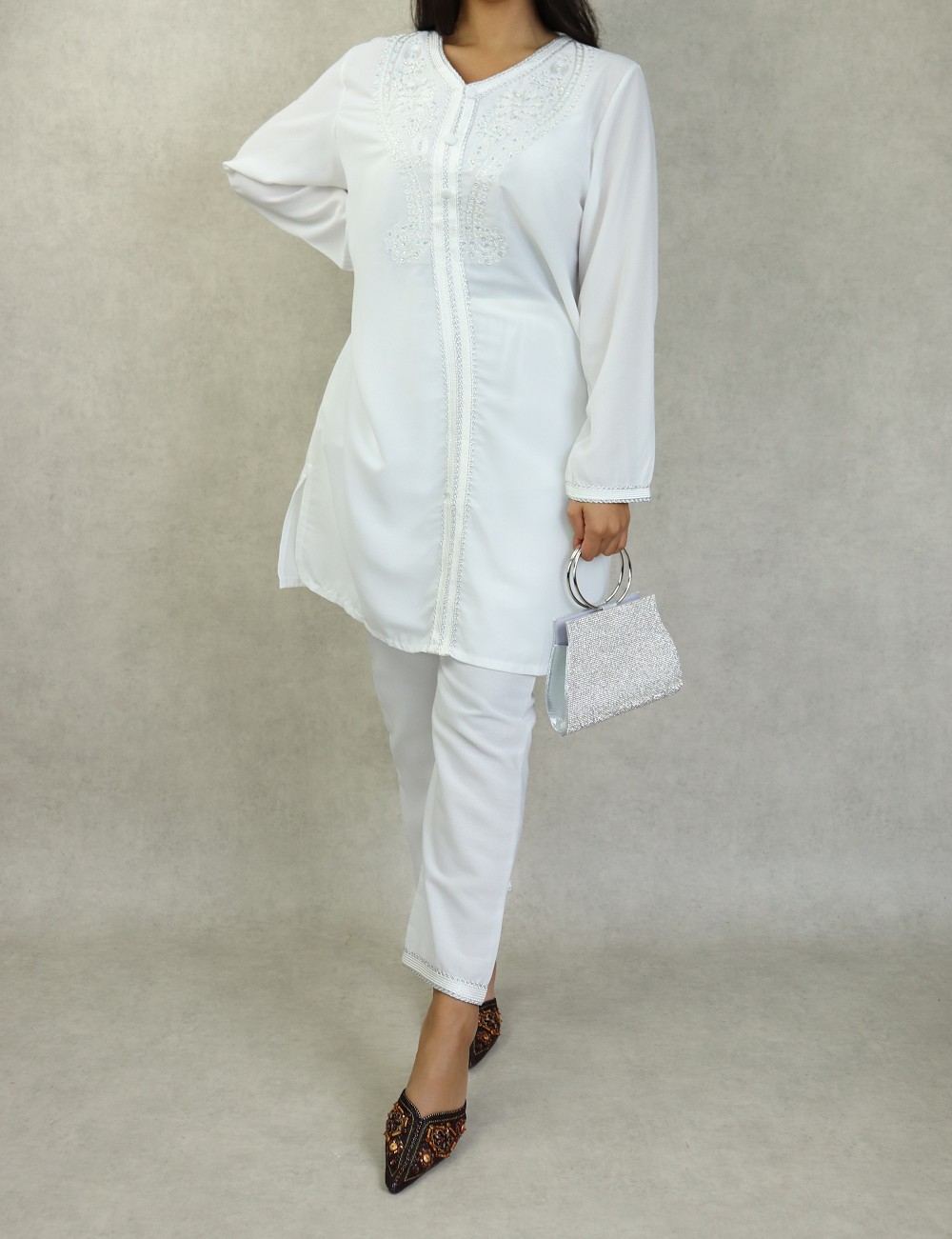 Jabador femme composé d’une tunique avec broderies sur le buste et sur les manches, et son pantalon assorti avec ceinture élastique, deux poches latérales, coupe droite.