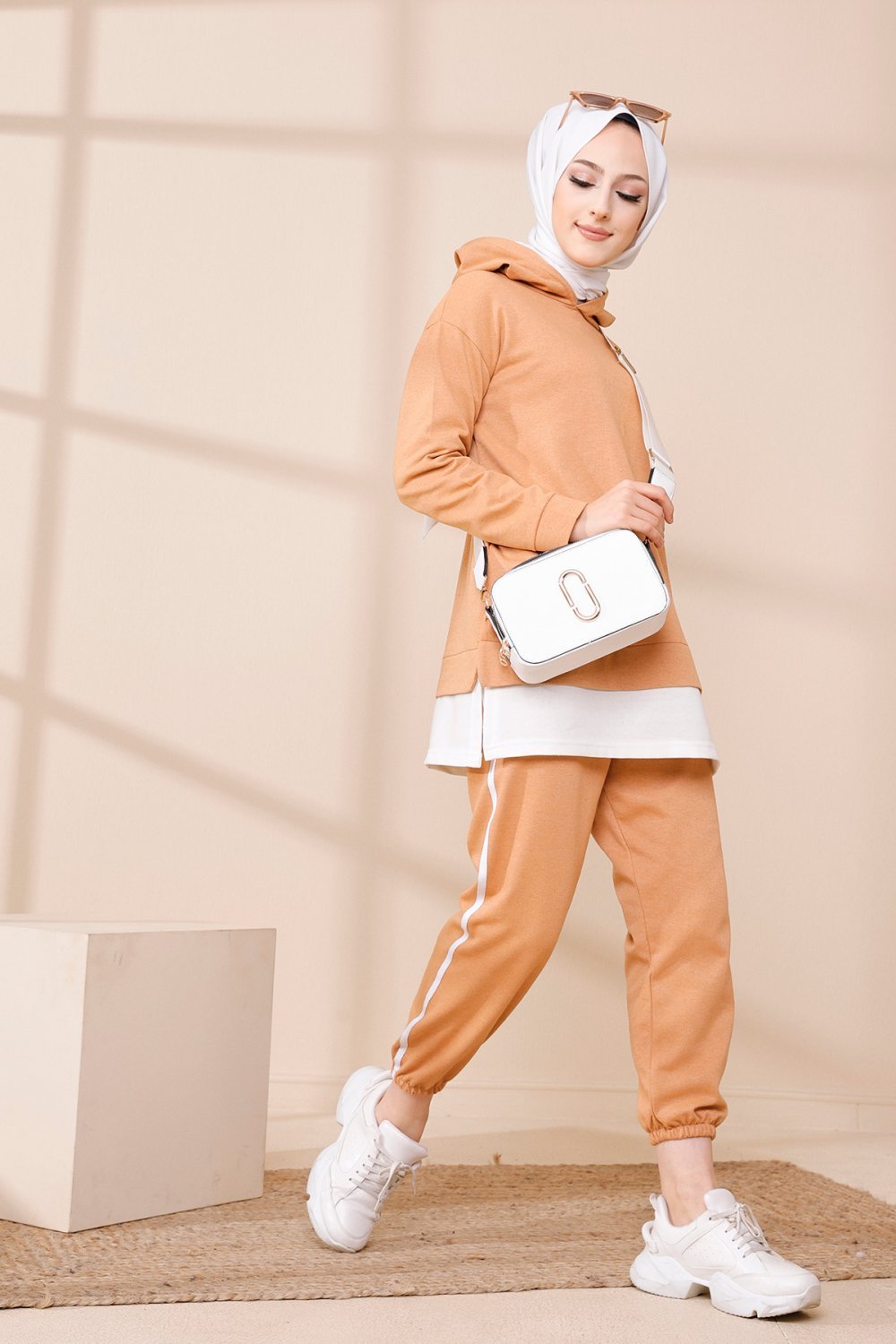Survêtement deux pièces composé d'un sweat à capuche, coupe droite et d'un pantalon taille élastique. Le Sweat-shirt est rallongé avec une extension de couleur blanche.