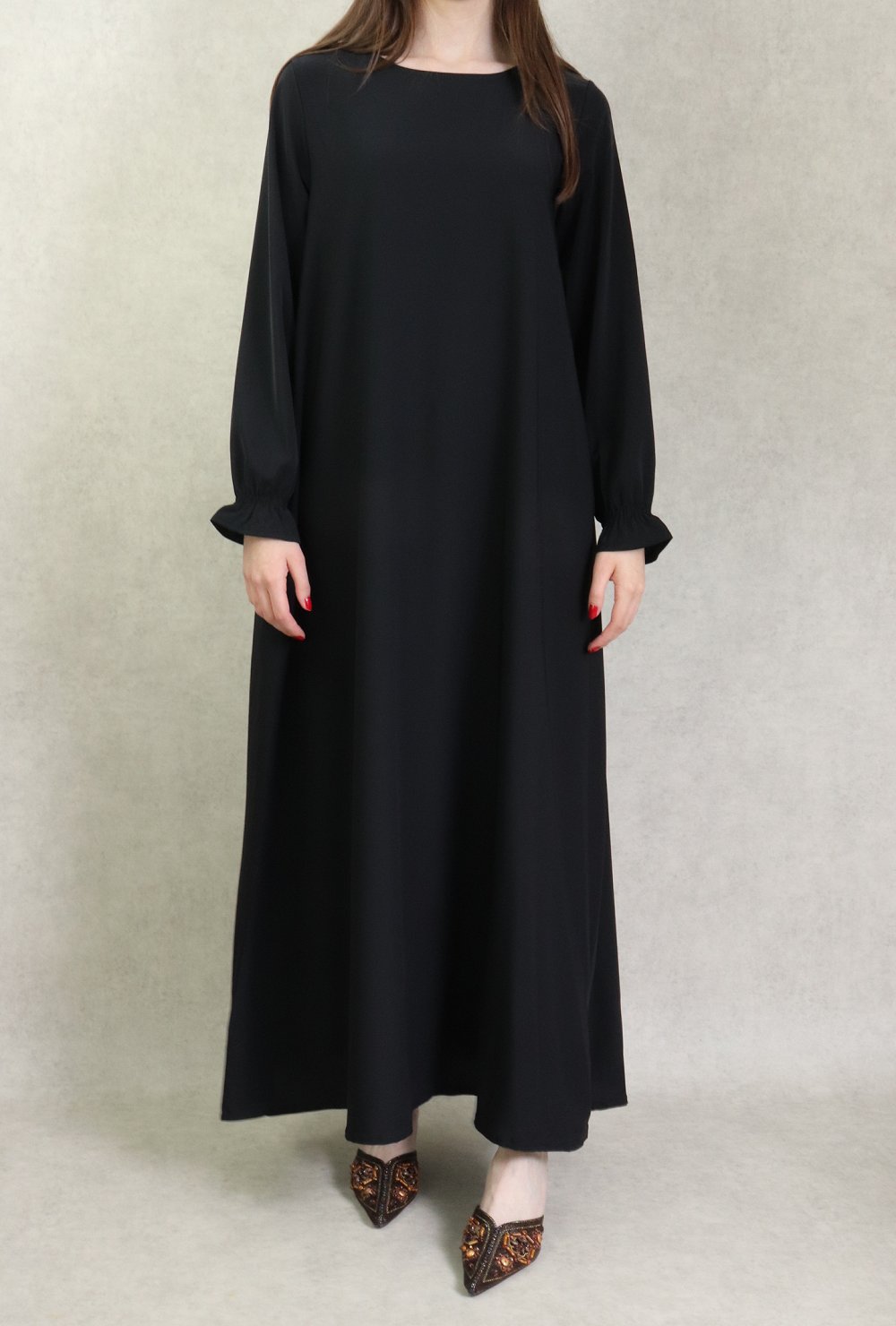 Jolie robe Abaya longue, col rond, coupe évasée, deux poches latérales, tissu nidah noir opaque. Beau tombé et très agréable à porter. Intemporel, il se porte en toutes saisons, en toutes occasions.