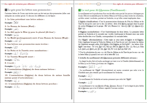 Les règles de tajwîd simplifiées sont expliqués à la fin du livre et le système des couleurs permet de savoir comment prononcer les lettres.