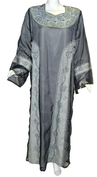 Robe de soirée Jamila grise en organza doublée avec broderie sur le col, les deux côtés du devant et les manches.