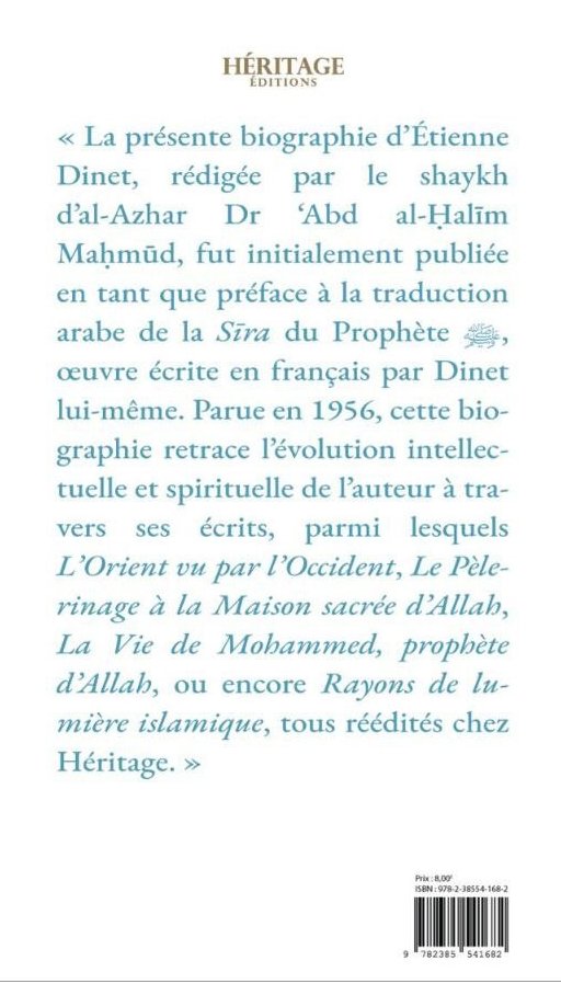 « La présente biographie d’Étienne Dinet, rédigée par le shaykh d’al-Azhar Dr ‘Abd al-Halim Mahmud, fut initialement publiée en tant que préface à la traduction arabe de la Sîra du Prophète ﷺ, œuvre écrite en français par Dinet lui-même. Parue en 1956, cette biographie retrace l’évolution intellectuelle et spirituelle de l’auteur à travers ses écrits, parmi lesquels L’Orient vu par l’Occident, Le Pèlerinage à la Maison sacrée d’Allah, La Vie de Mohammed, prophète d’Allah, ou encore Rayons de lumière islamique, tous réédités chez Héritage. »