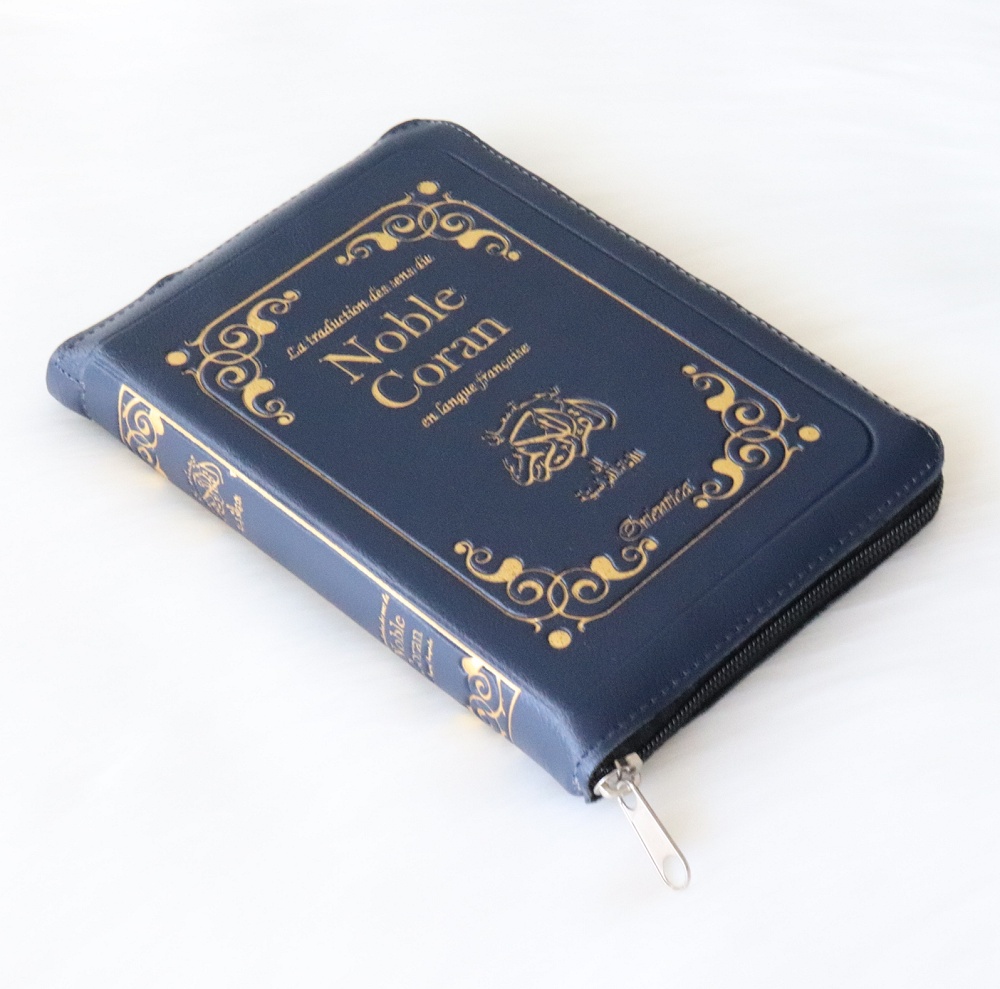 Très beau Coran au format poche 12 x 17 cm avec fermeture zip pratique pour emporter avec soit (Le Coran est protégé par sa couverture plastifiée étanche bleu-nuit). Avec marque page en soie intégré.
