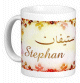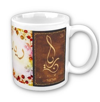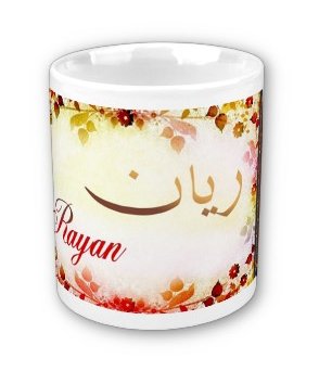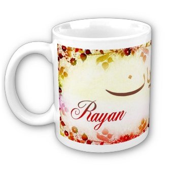 Mug avec le prénom "Rayan" calligraphié en arabe (ريان) ainsi que son épellation lettre par lettre en arabe.
