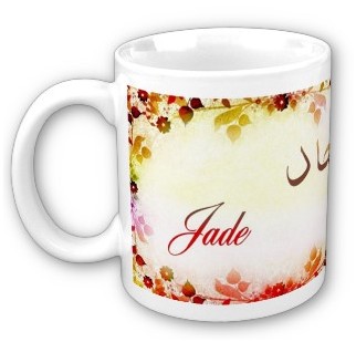 Mug avec le prénom "Jade" calligraphié en arabe (جاد) ainsi que son épellation lettre par lettre en arabe.