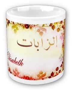 Mug avec le prénom "Elisabeth" calligraphié en arabe (الزابات) ainsi que son épellation lettre par lettre en arabe.
