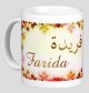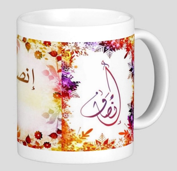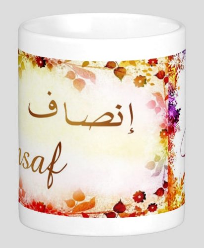 Mug avec le prénom "Insaf" écrit en français, en arabe (إنصاف) et calligraphié de façon artistique en arabe sur la partie droite.