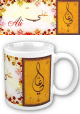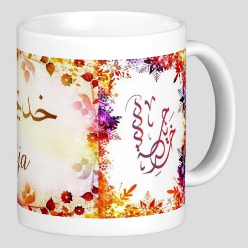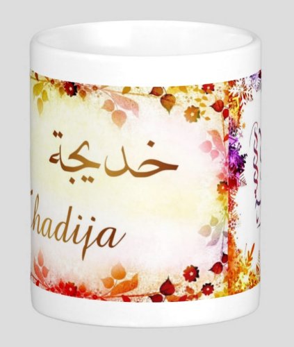 Mug avec le prénom "Khadija" écrit en français, en arabe (خديجة) et calligraphié de façon artistique en arabe sur la partie droite.