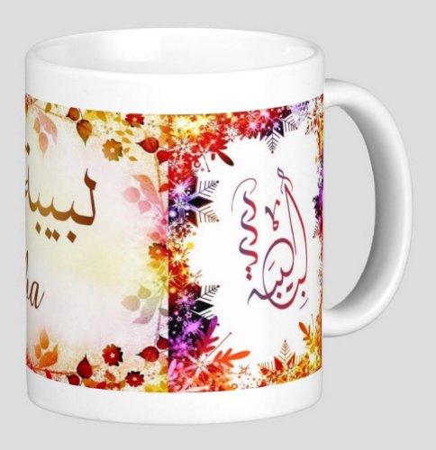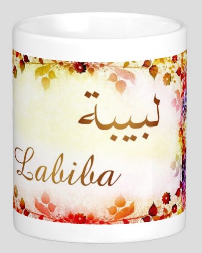 Mug avec le prénom "Labiba" écrit en français, en arabe (لبيبة) et calligraphié de façon artistique en arabe sur la partie droite.