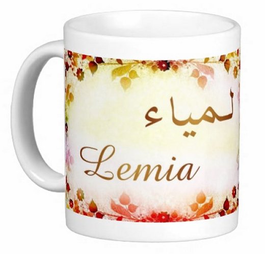 Mug avec le prénom "Lemia" écrit en français, en arabe (لمياء) et calligraphié de façon artistique en arabe sur la partie droite.