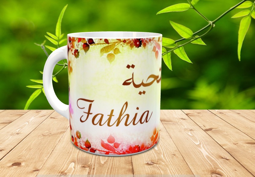 Mug avec le prénom "Fathia" écrit en français, en arabe (فتحية) et calligraphié de façon artistique en arabe sur la partie droite.