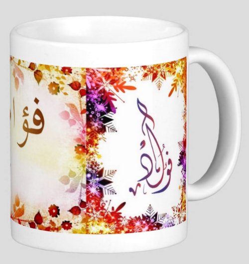 Mug avec le prénom "Fouad" écrit en français, en arabe (فؤاد) et calligraphié de façon artistique en arabe sur la partie droite.