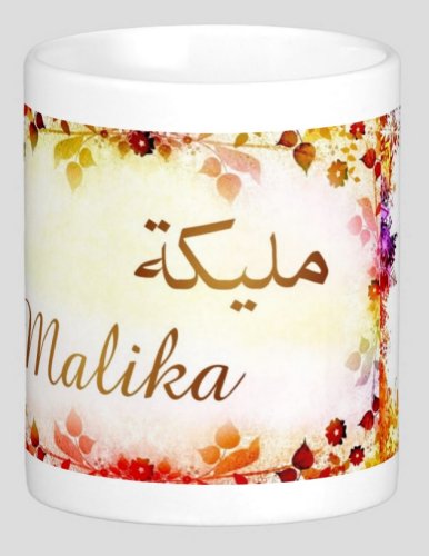 Mug avec le prénom "Malika" écrit en français, en arabe (مليكة) et calligraphié de façon artistique en arabe sur la partie droite.