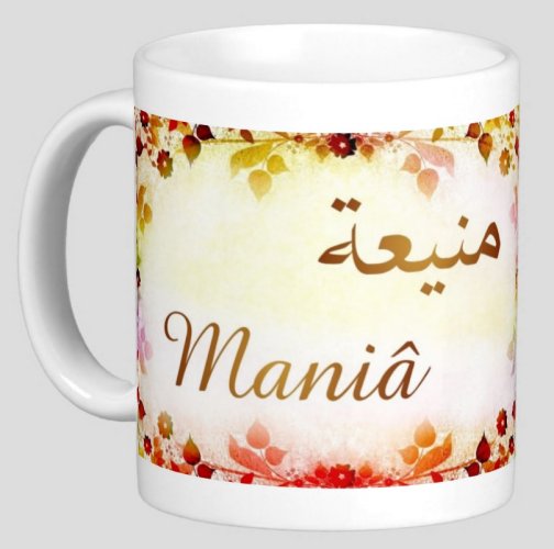 Mug avec le prénom "Maniâ" écrit en français, en arabe (منيعة) et calligraphié de façon artistique en arabe sur la partie droite.