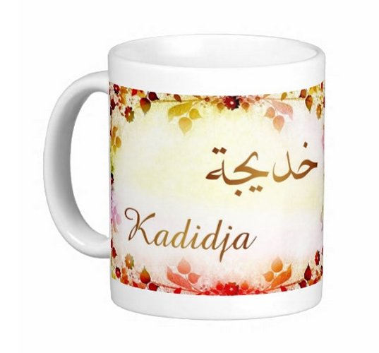 Mug avec le prénom "Kadidja" écrit en français, en arabe (خديجة) et calligraphié de façon artistique en arabe sur la partie droite.