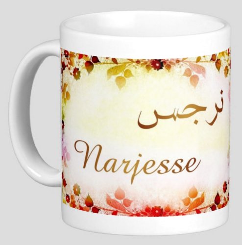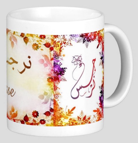 Mug avec le prénom "Narjesse" écrit en français, en arabe (نرجس) et calligraphié de façon artistique en arabe sur la partie droite.