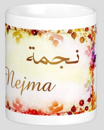Mug avec le prénom "Nejma" écrit en français, en arabe (نجمة) et calligraphié de façon artistique en arabe sur la partie droite.