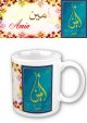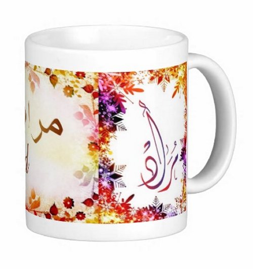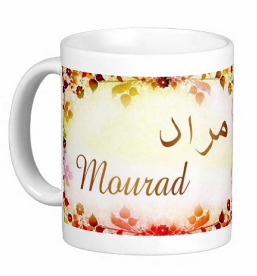 Mug avec le prénom "Mourad" écrit en français, en arabe (مراد) et calligraphié de façon artistique en arabe sur la partie droite.