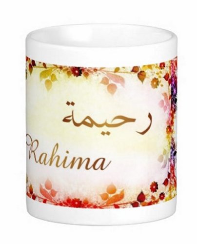 Mug avec le prénom "Rahima" écrit en français, en arabe (رحيمة) et calligraphié de façon artistique en arabe sur la partie droite.