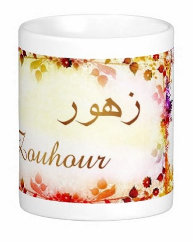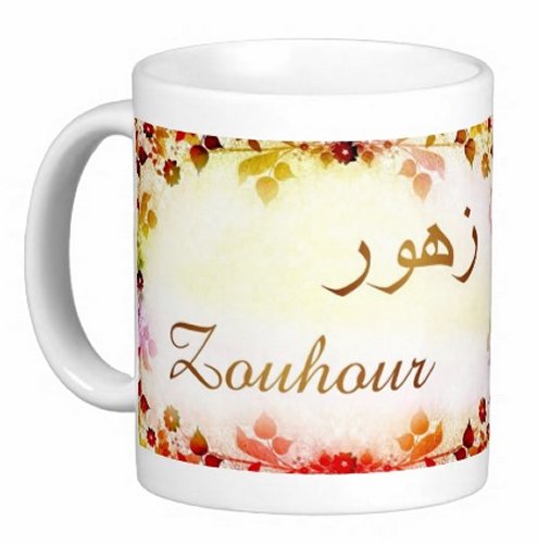 Mug avec le prénom "Zouhour" écrit en français, en arabe (زهور) et calligraphié de façon artistique en arabe sur la partie droite.