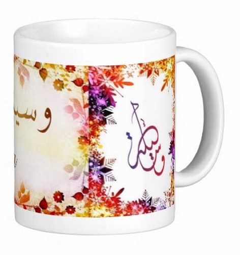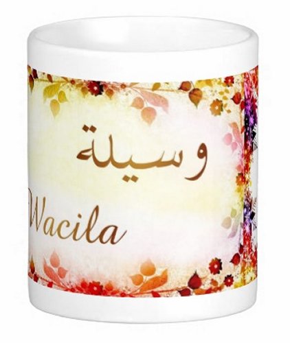 Mug avec le prénom "Wacila" écrit en français, en arabe (وسيلة) et calligraphié de façon artistique en arabe sur la partie droite.