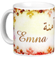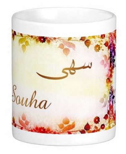 Mug avec le prénom "Souha" écrit en français, en arabe (سهى) et calligraphié de façon artistique en arabe sur la partie droite.