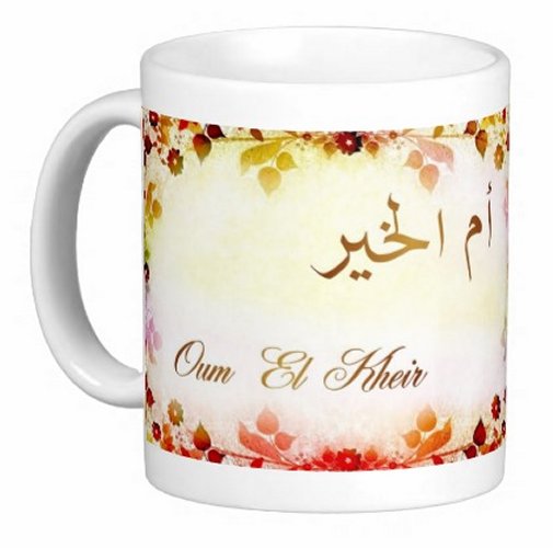 Mug avec le prénom "Oum El Kheir" écrit en français, en arabe (أم الخير) et calligraphié de façon artistique en arabe sur la partie droite.