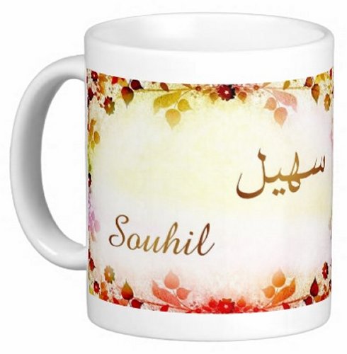 Mug avec le prénom "Souhil" écrit en français, en arabe (سهيل) et calligraphié de façon artistique en arabe sur la partie droite.