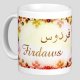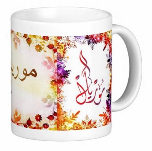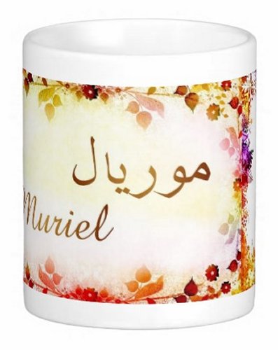 Mug avec le prénom "Muriel" écrit en français, en arabe (موريال) et calligraphié de façon artistique en arabe sur la partie droite.
