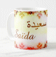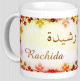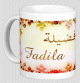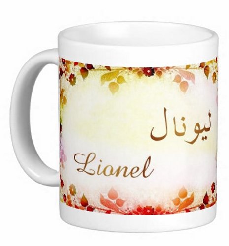 Mug avec le prénom "Lionel" écrit en français, en arabe (ليونال) et calligraphié de façon artistique en arabe sur la partie droite.