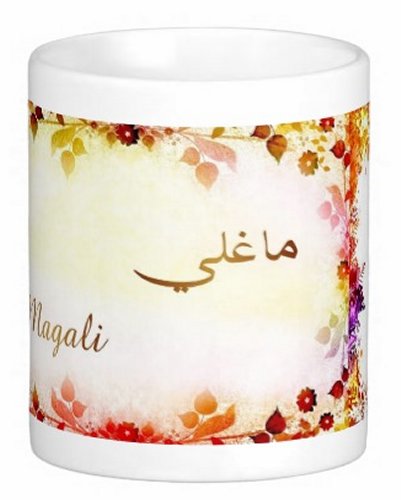 Mug avec le prénom "Magali" écrit en français, en arabe (ماغلي) et calligraphié de façon artistique en arabe sur la partie droite.